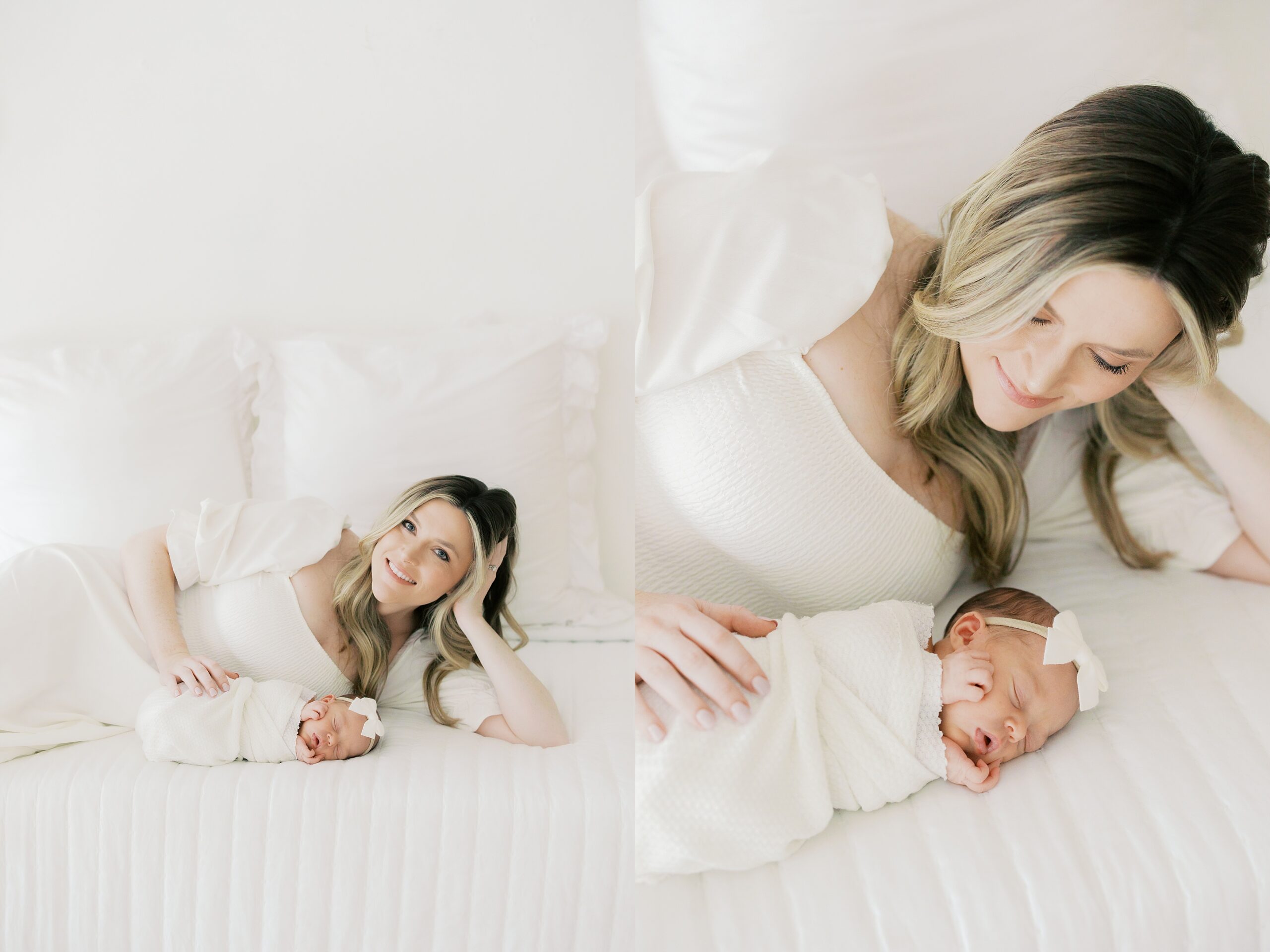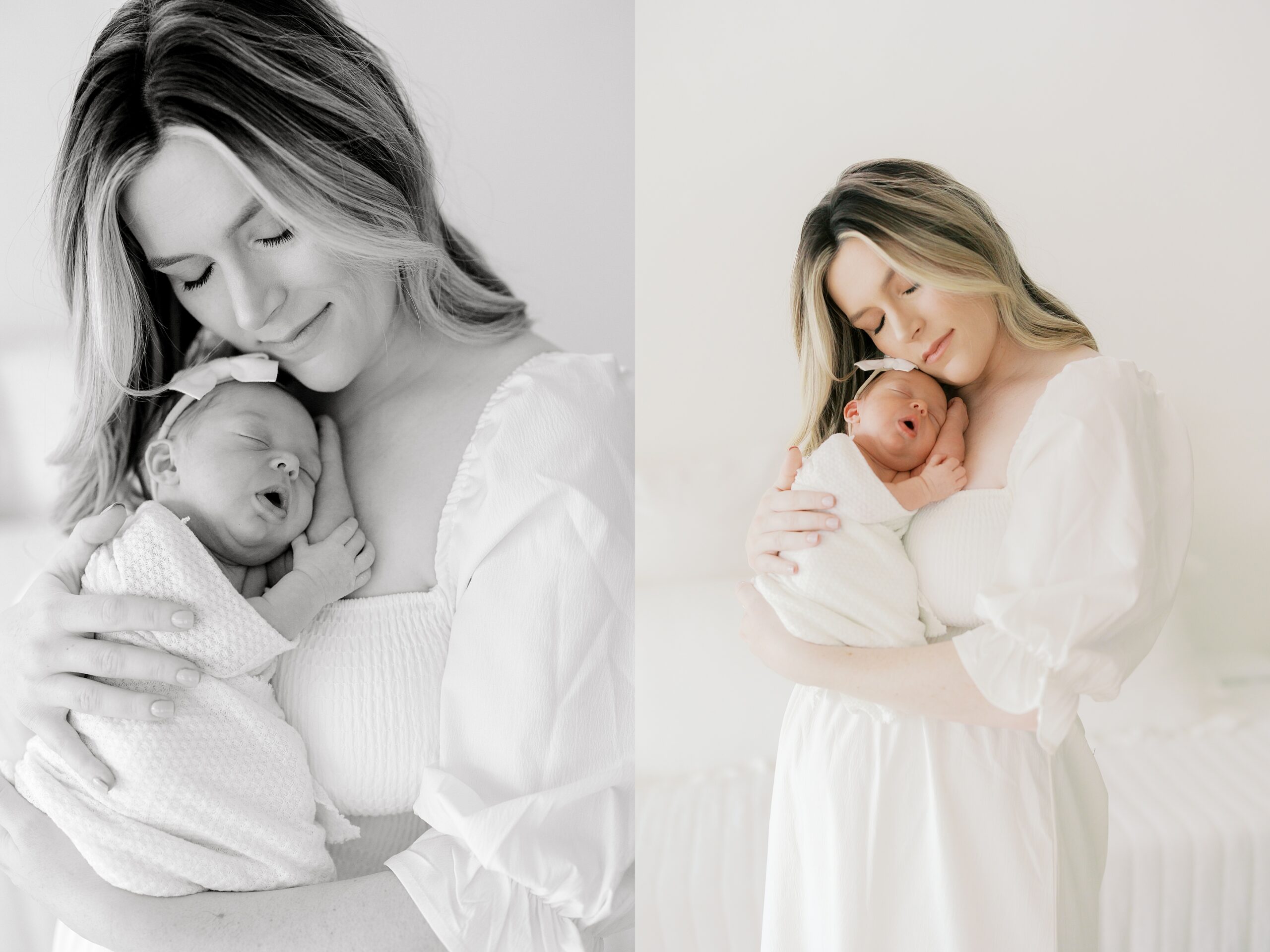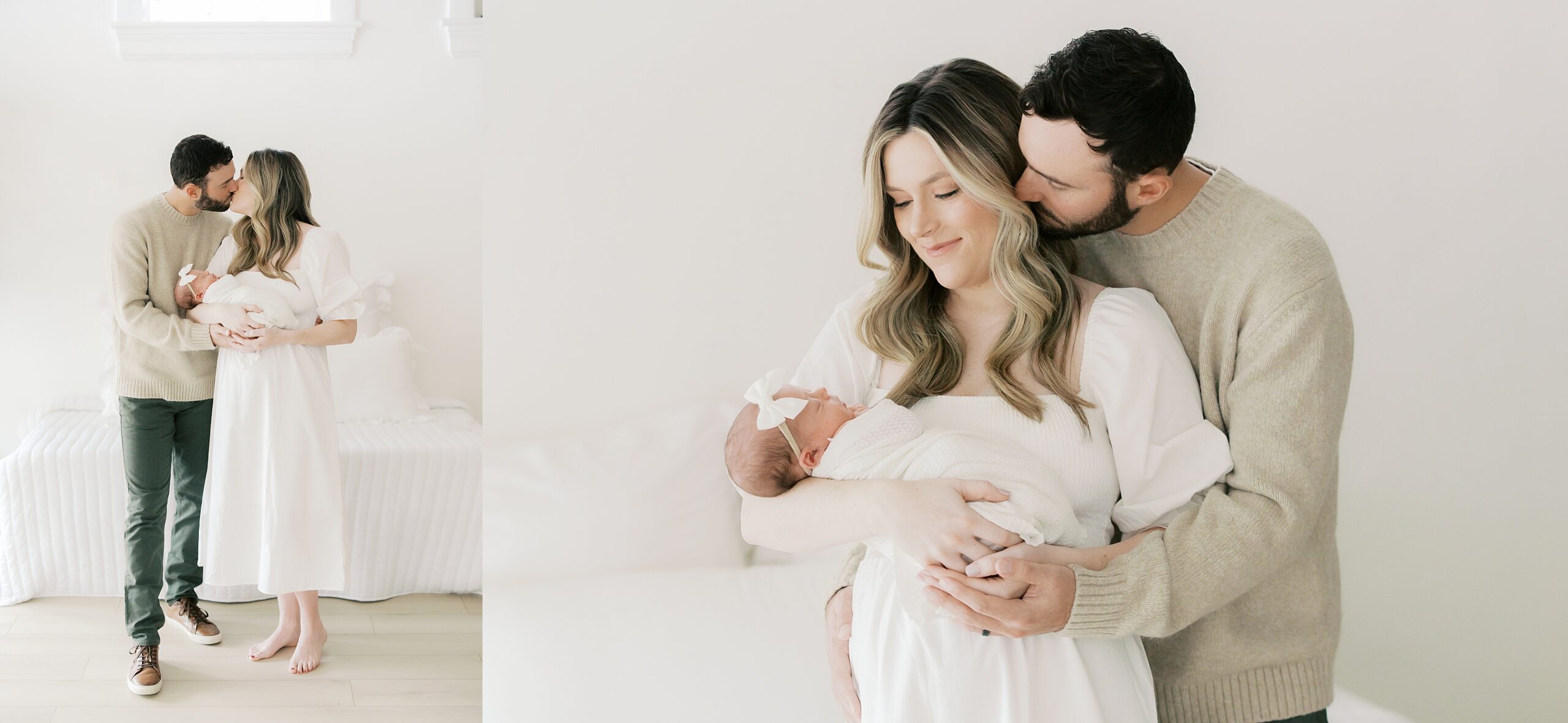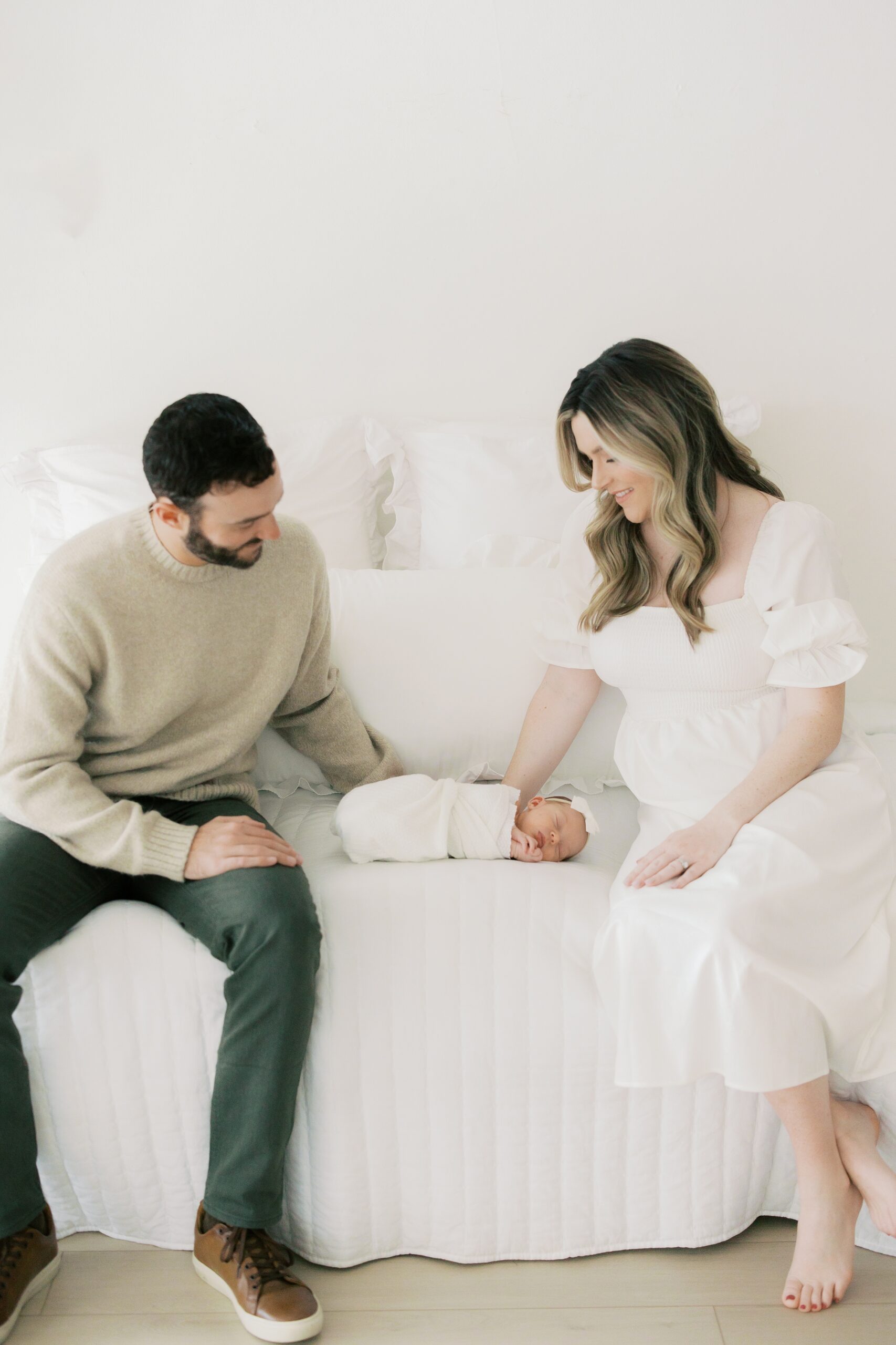 Mom is wearing a simple white dress from the client wardrobe